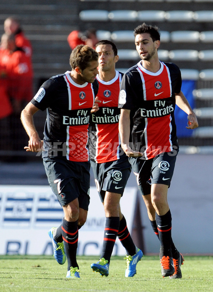 得点を決め、チームメイトト歓喜するパリ・サンジェルマンのハビエル・パストレ(Javier Pastore、右、2011年9月18日撮影)。(c)AFP/JEAN-PIERRE CLATOT