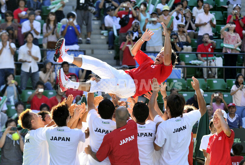 ワールドグループ復帰を喜ぶ日本の選手(2011年9月18日撮影)。(c)AFP/KAZUHIRO NOGI