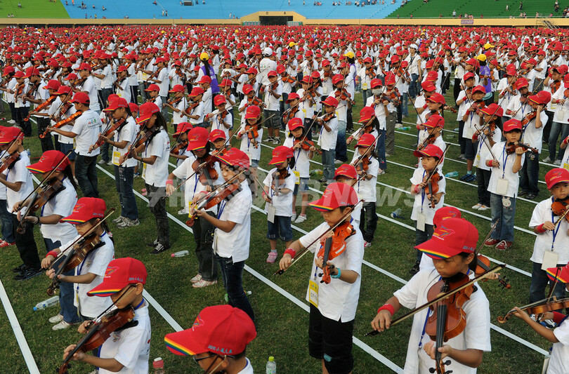ニュース ライフ こぼれ話 4645人でバイオリン演奏、86年ぶりにギネス記録更新 台湾 2011年9月19日 9:08 発信地:台北/台湾 [ 中国・台湾 台湾 ] このニュースをシェア ‹ › ❮ 4/5 ❯ 台湾・彰化(Changhua)県で一斉にバイオリンを演奏する子どもたち(2011年9月18日撮影)。(c)AFP/Sam YEH 画像作成中 ! 【9月19日 AFP】台湾中部の彰化(Changhua)県で18日、18歳未満の子ども4645人が一斉にバイオリンを演奏し、同時に大勢でバイオリンを演奏するギネス世界記録(Guinness World Records)を86年ぶりに更新した。これまでの記録は1925年にロンドン(London)で樹立された4000人だった。(c)AFP ライフ 一覧へ> メディア・報道関係・法人の方向け 写真・動画 購入のお問合せ>