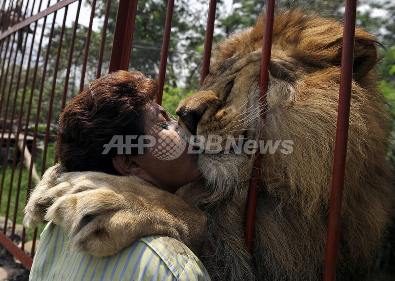 写真は、ビラ・ロレーナ動物保護センターで、12年前に保護したライオン、フピテル(Jupiter)にキスするトーレスさん(2011年9月17日撮影)。(c)AFP/Luis ROBAYO