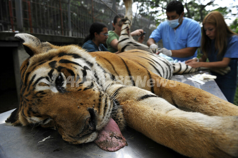 写真は、ビラ・ロレーナ動物保護センターで手術を受けるベンガルトラのダニー(Dany、2011年9月17日撮影)。(c)AFP/Luis ROBAYO