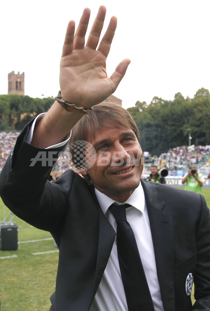 試合開始を前にサポーターの歓声に応えるユベントスのアントニオ・コンテ監督(Antonio Conte、2011年9月18日撮影)。(c)AFP/FABIO MUZZI