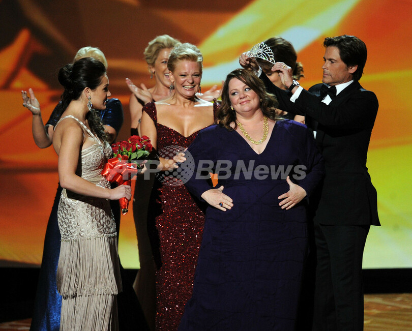 第63回プライムタイム・エミー賞(Primetime Emmy Awards)授賞式が18日、米ロサンゼルス(Los Angeles)で行われた。写真は、連続コメディー部門の主演女優賞を受賞し、他の候補者たちから祝福を受けるメリッサ・マッカーシー(Melissa McCarthy、2011年9月18日撮影)。(c)AFP/Getty Images/Kevin Winter