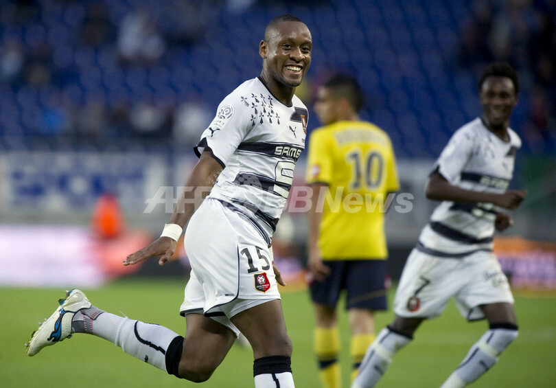 前半35分にチーム2得点目を挙げて歓喜するレンヌのジャン・アルメル・カナ・ビイク(Jean Armel Kana Biyik、2011年9月21日撮影)。(c)AFP/SEBASTIEN BOZON