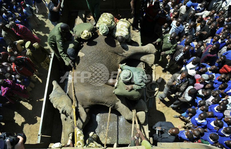 【9月23日 AFP】ケニア南西の町ナロク(Narok)郊外で22日、作物を荒らすなど多発するゾウ被害対策として、気性の荒いゾウ50頭をマサイマラ国立保護区(Maasai Mara Game Reserve)に移送する作業が始まった。この日はヘリコプターから鎮静剤の矢を放って4頭を捕獲した。(c)AFP