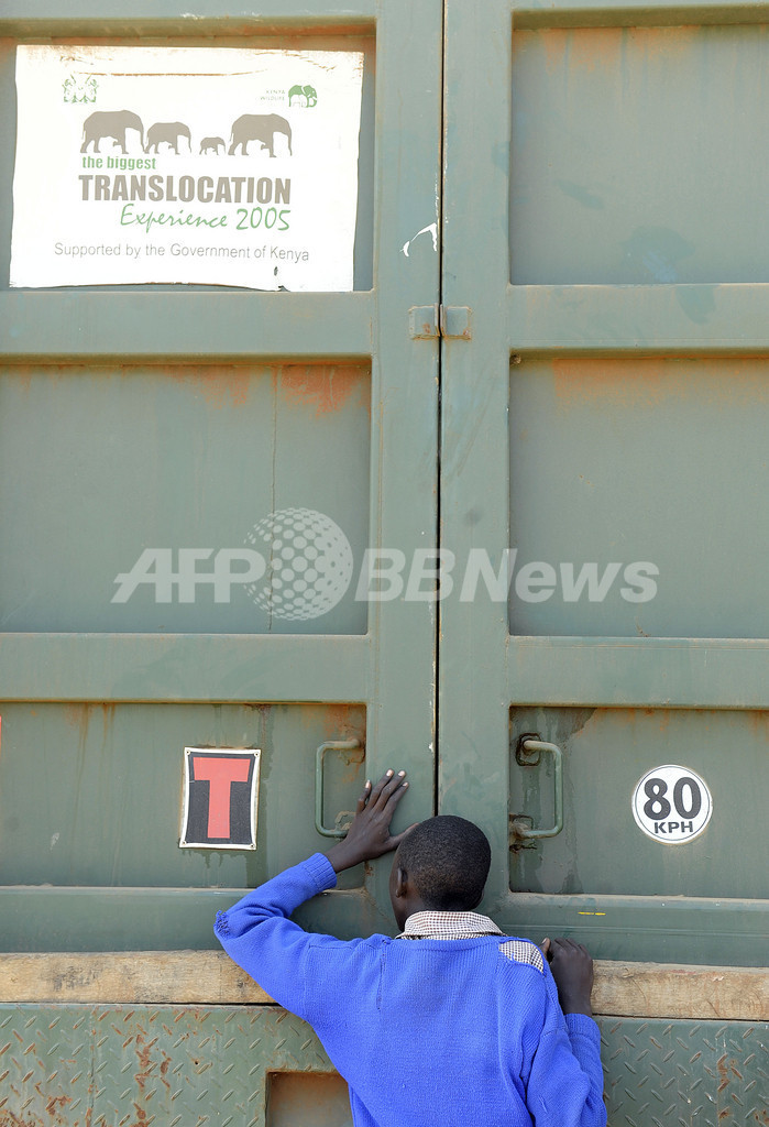 写真は、移送用の木箱に入れられたゾウを、箱の隙間から見ようとする少年(2011年9月22日撮影)。(c)AFP/Tony KARUMBA