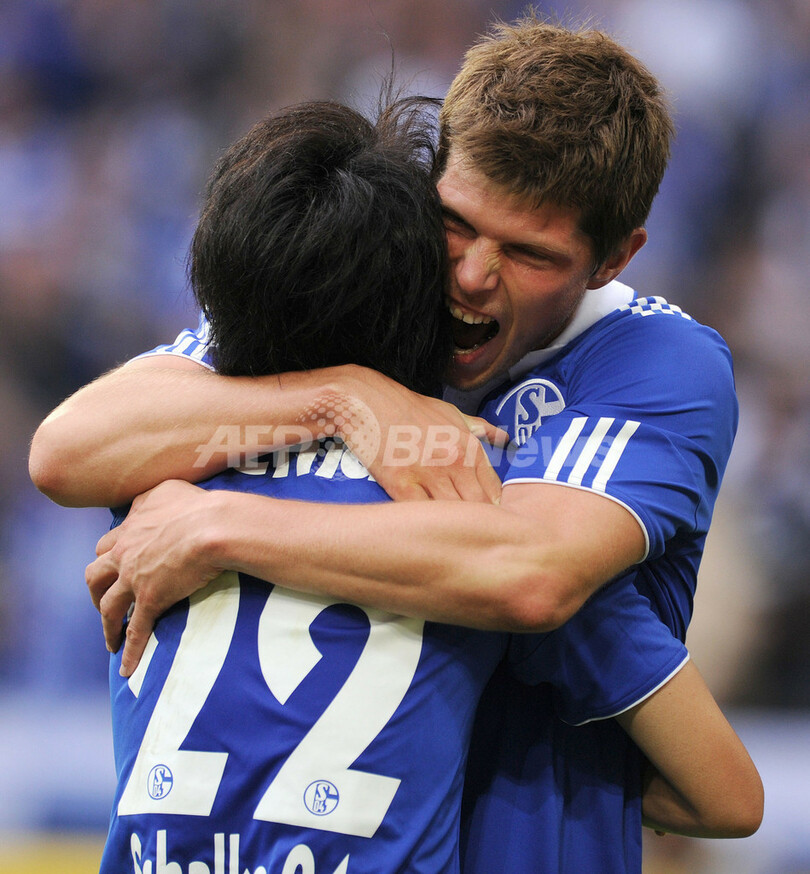 後半17分に得点を決め、内田篤人(Atsuto Uchida、左)と喜ぶシャルケ04のクラース・ヤン・フンテラール(Klaas-Jan Huntelaar、2011年9月24日撮影)。(c)AFP/PATRIK STOLLARZ