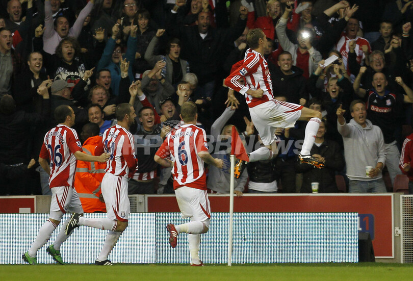 後半7分に同点ゴールを決め歓喜するストーク・シティのピーター・クラウチ(Peter Crouch、右、2011年9月24日撮影)。(c)AFP/IAN KINGTON