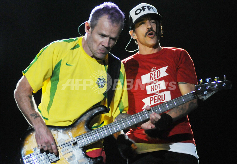 写真は、ステージで熱唱するレッド・ホット・チリ・ペッパーズのアンソニー・キーディス(Anthony Kiedis、右)とベーシストのフリー(Flea、2011年9月25日撮影)。(c)AFP/ANDRE DURAO