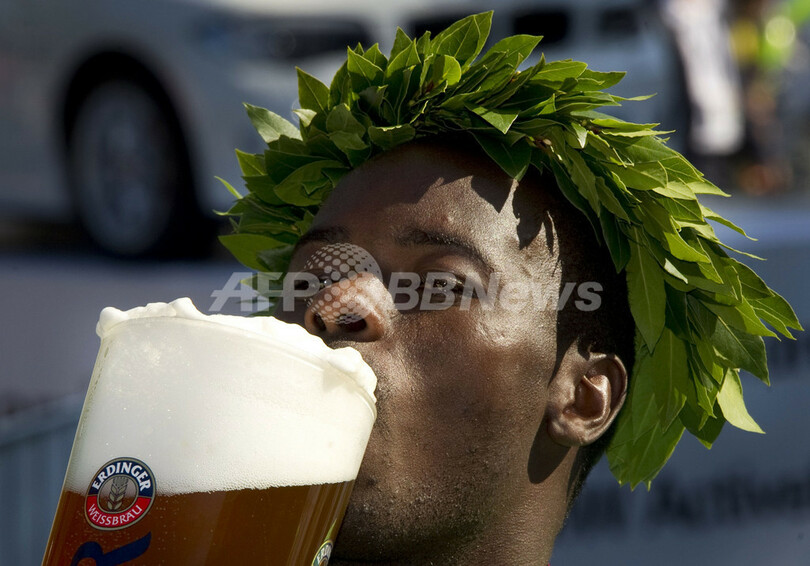 優勝を飾り、ビールで祝杯を挙げるパトリック・マカウ(2011年9月25日撮影)。(c)AFP/ODD ANDERSEN