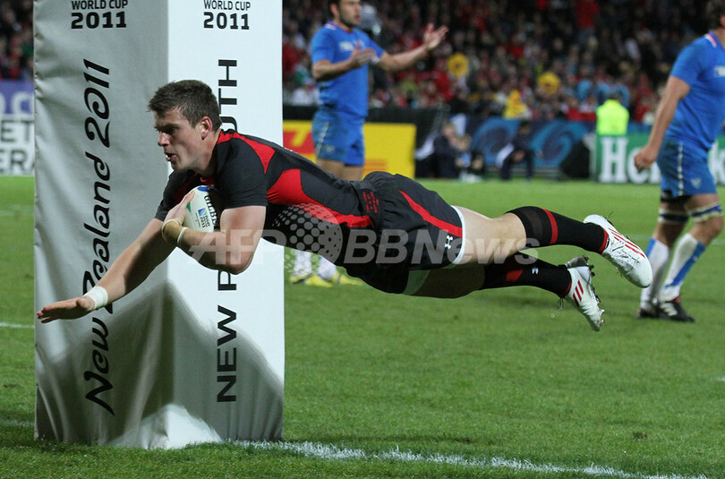 【9月26日 AFP】2011年ラグビーW杯ニュージーランド大会(Rugby World Cup 2011)は25日、ニュープリマス(New Plymouth)のスタジアム・タラナキ(Stadium Taranaki)で一次リーグD組の試合が行われ、ウェールズがナミビアに81-7で大勝した。(c)AFP