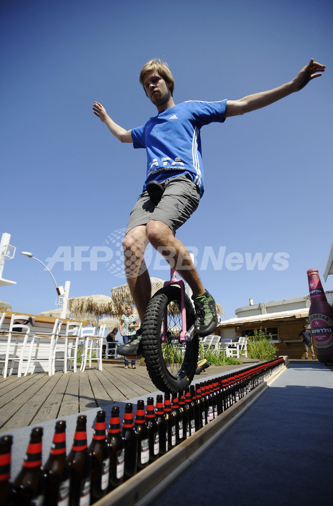ニュース ライフ こぼれ話 ビールびんの上を一輪車で渡ってギネス記録、イスラエル 2011年9月27日 9:12 発信地:テルアビブ/イスラエル [ 中東・北アフリカ イスラエル ] このニュースをシェア ‹ › ❮ 1/2 ❯ ビールびん渡りに挑戦中のルッツ・エイクホルツ(Lutz Eichholz)さん(2011年9月26日撮影)。(c)AFP/DAVID BUIMOVITCH 画像作成中 ! 【9月27日 AFP】イスラエル・テルアビブ(Tel Aviv)で26日、一列に並んだビールびんの上を一輪車で渡るドイツ人のルッツ・エイクホルツ(Lutz Eichholz)さん(25)。これまでの記録7.99メートルを上回る8.93メートル、127本を渡り、ギネス世界記録を更新した。(c)AFP ライフ 一覧へ> メディア・報道関係・法人の方向け 写真・動画 購入のお問合せ>