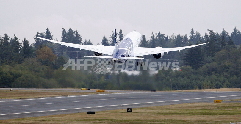 写真は米ワシントン州エバレットのペインフィールド空港を離陸するボーイング787ドリームライナー1号機(2011年9月27日撮影)。(c)AFP/KEVIN P. CASEY