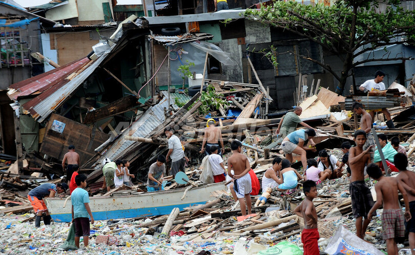 写真はフィリピン・マニラ湾(Manila Bay)沿岸部で、台風17号で倒壊した住宅から使えるものを拾い集める住民ら(2011年9月28日撮影)。(c)AFP/JAY DIRECTO
