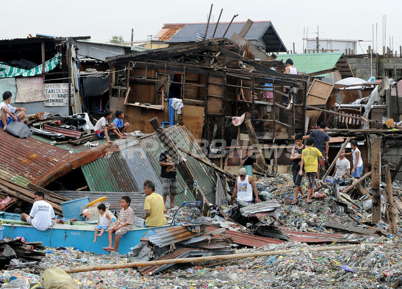 写真はフィリピン・マニラ湾(Manila Bay)沿岸部で、台風17号で倒壊した住宅から使えるものを拾い集める住民ら(2011年9月28日撮影)。(c)AFP/JAY DIRECTO
