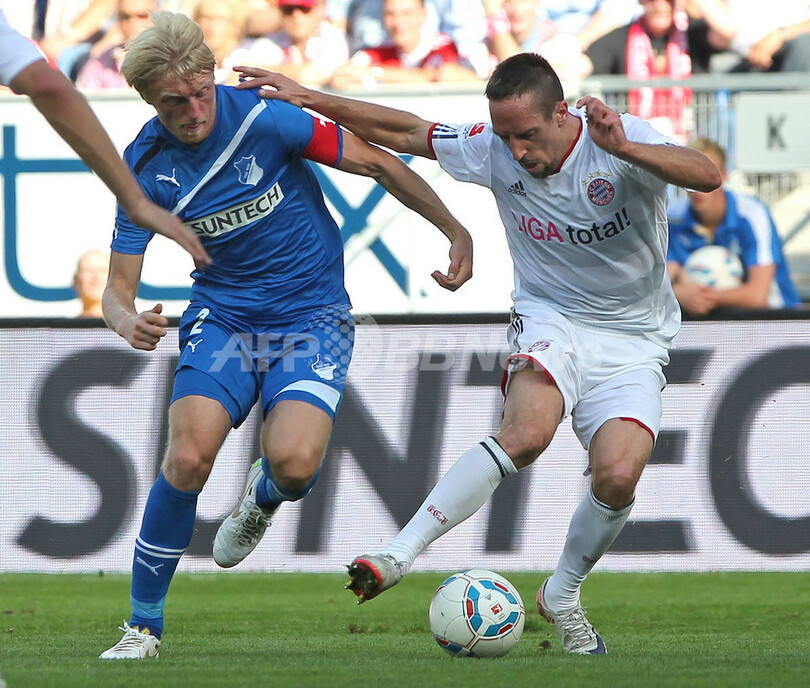 1899ホッフェンハイムのアンドレアス・ベック(Andreas Beck、左)のチェックを受けるバイエルン・ミュンヘンのフランク・リベリ(Franck Ribery、右、2011年10月1日撮影)。(c)AFP/DANIEL ROLAND
