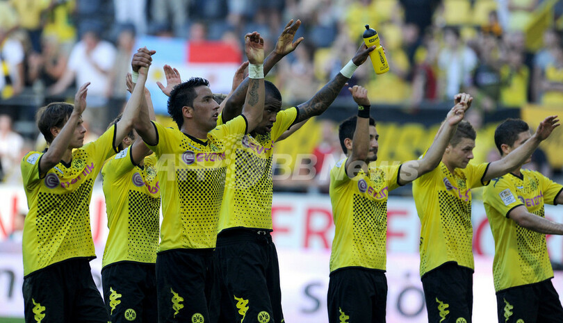 試合に勝利し歓声に応えるボルシア・ドルトムントの選手(2011年10月1日撮影)。(c)AFP/PATRIK STOLLARZ