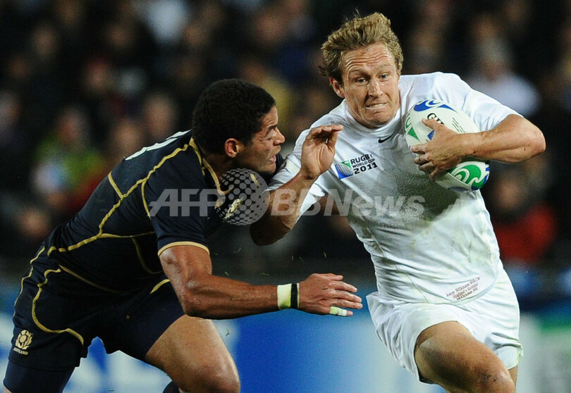 スコットランドのジョー・アンズブロ(Joe Ansbro)のタックルをかわすイングランドのジョニー・ウィルキンソン(Jonny Wilkinson、2011年10月1日撮影)。(c)AFP/PHILIPPE LOPEZ