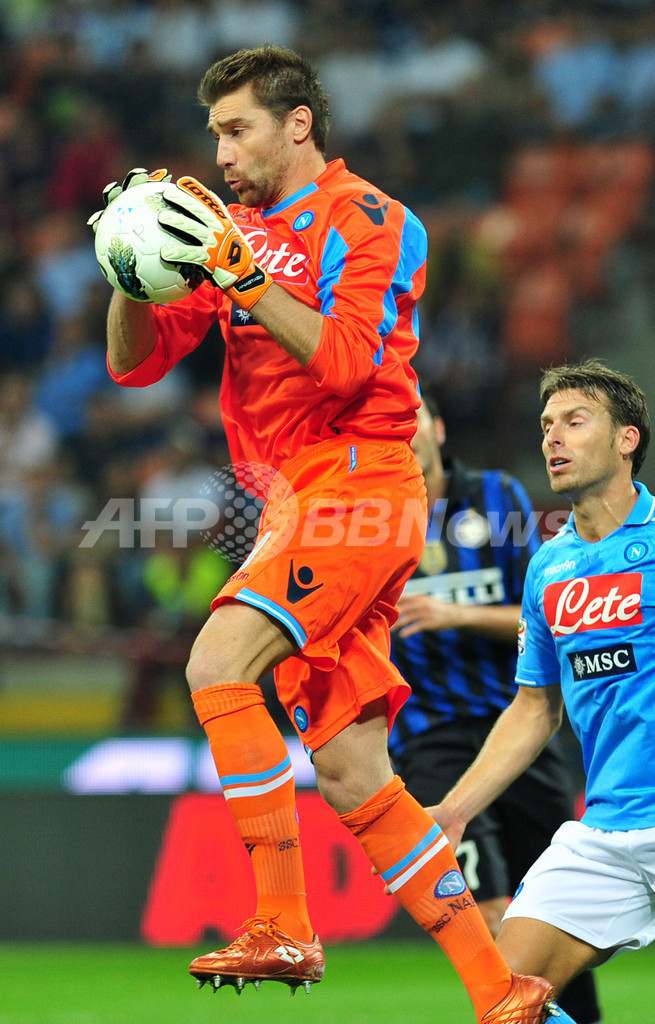 ボールをキャッチするナポリのGKモルガン・デ・サンクティス(Morgan De Sanctis、2011年10月1日撮影)。(c)AFP/ALBERTO PIZZOLI