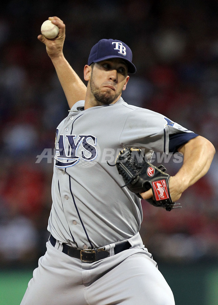 レンジャーズ戦に先発登板し、5回6安打7失点で敗戦投手となったレイズのジェームズ・シールズ(James Shields、2011年10月1日撮影)。(c)AFP/Getty Images/Ronald Martinez