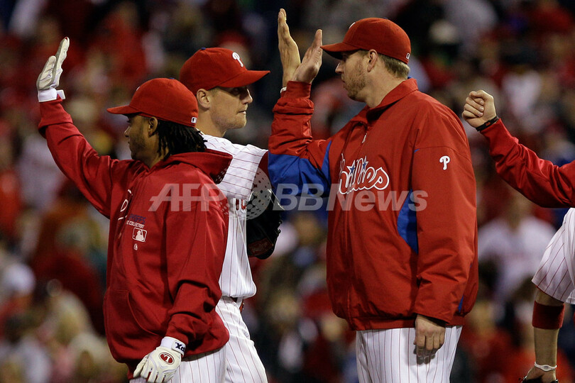 試合に勝利し、チームメイトを出迎えるフィリーズのロイ・ハラディ(Roy Halladay、2011年10月1日撮影)。(c)AFP/Getty Images/Rob Carr
