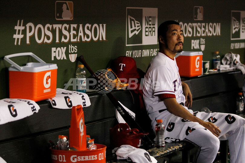 レンジャーズの3番手で登板するも、アウトを1個も取れず2安打3失点で降板し、ダグアウトで試合を見つめる上原浩治(Koji Uehara、2011年10月1日撮影)。(c)AFP/Getty Images/Tom Pennington
