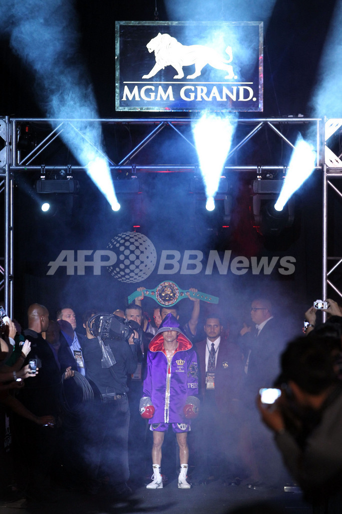 選手紹介で入場する西岡利晃(2011年10月1日撮影)。(c)AFP/Getty Images/Jeff Bottari
