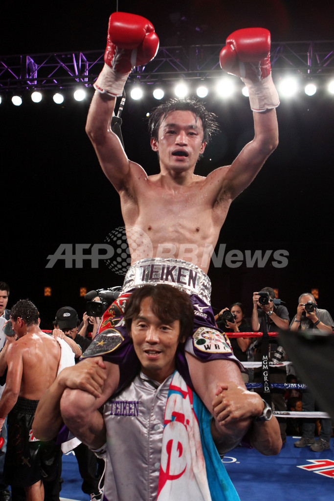 7度目の防衛に成功し歓喜する西岡利晃(2011年10月1日撮影)。(c)AFP/Getty Images/Jeff Bottari