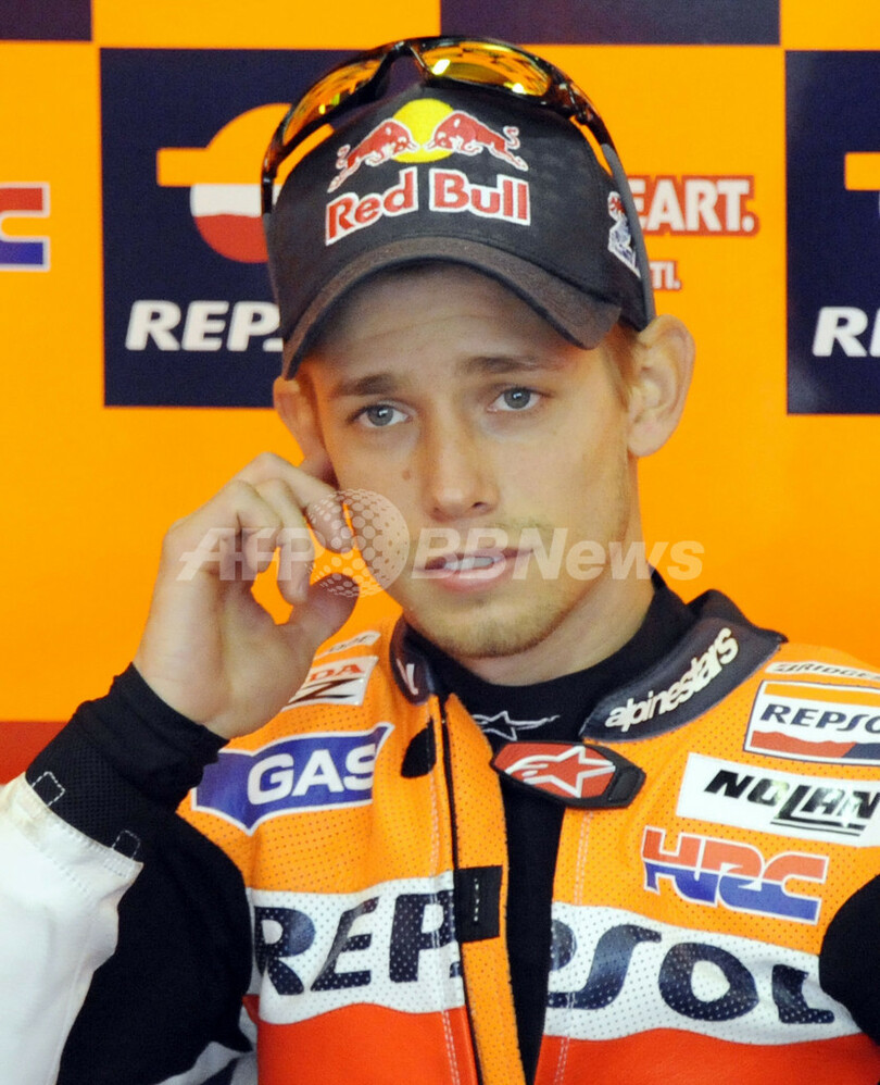 ピットで待機するレプソル・ホンダ(Repsol Honda)のケーシー・ストーナー(Casey Stoner、2011年10月2日撮影)。(c)AFP/TOSHIFUMI KITAMURA