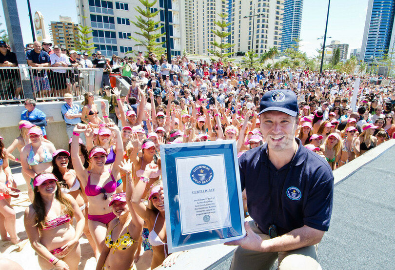 【10月2日 AFP】オーストラリア・ゴールドコースト市(Gold Coast City)の人気ビーチ、サーファーズ・パラダイス(Surfers Paradise)で2日、「世界で最も長いビキニ姿のパレード」のギネス世界記録(Guinness World Record)に挑戦するイベントが行われた。サーファーズ・パラダイスには357人のビキニ姿の女性たちが集まり、2010年に英領ケイマン諸島(Cayman Islands)のアマチュア水泳協会が打ち立てた331人の記録を見事更新した。(c)AFP