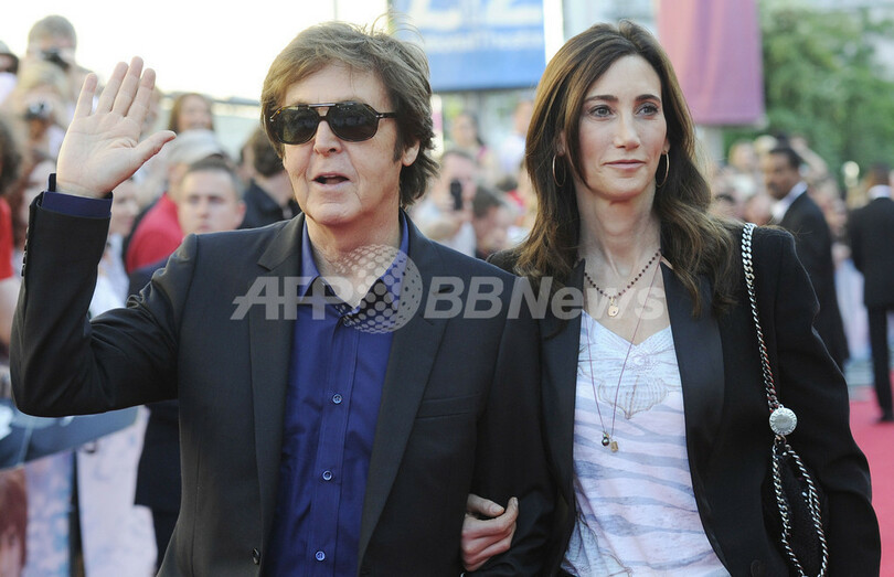 写真は、レッドカーペットに登場したマッカートニーと婚約者のナンシー・シェベル(Nancy Shevell)さん(2011年10月2日撮影)。(c)AFP/FACUNDO ARRIZABALAGA