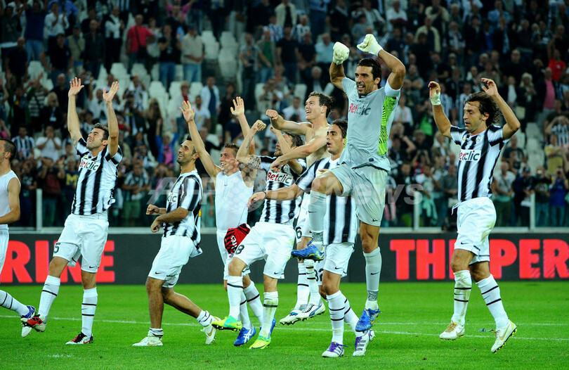 勝利を喜ぶユベントスの選手(2011年10月2日撮影)。(c)AFP/OLIVIER MORIN