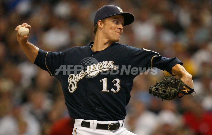 先発登板し、5回を投げ3本塁打を含む8安打4失点を喫したミルウォーキー・ブルワーズのザック・グレインキー(Zach Greinke、2011年10月2日撮影)。(c)AFP/Getty Images/Jared Wickerham