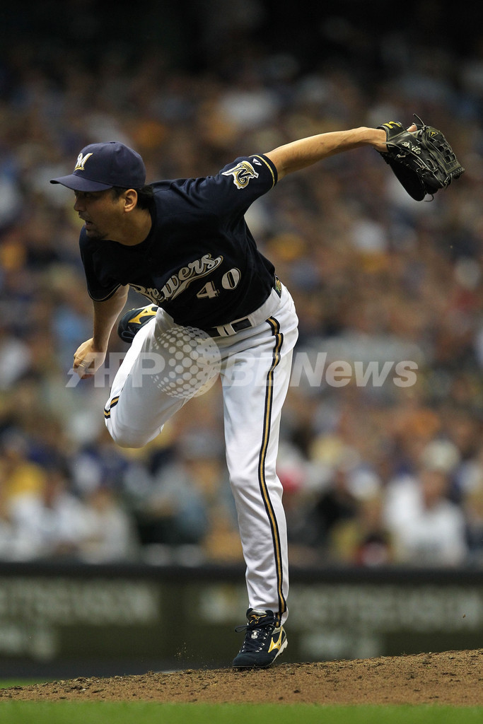 6回に2番手として登板し、1回を1安打無失点に抑え勝ち投手となったブルワーズの斎藤隆(Takashi Saito、2011年10月2日撮影)。(c)AFP/Getty Images/Jonathan Daniel