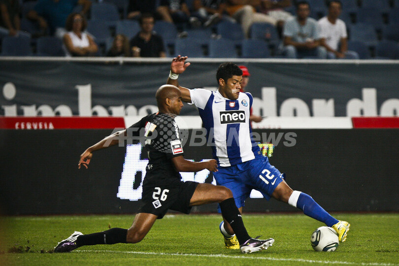 アカデミカ・コインブラのニバウド・サントス(Nivaldo Santos、左)とボールを競るFCポルトのフッキ(Hulk、2011年10月2日撮影)。(c)AFP/PATRICIA DE MELO MOREIRA