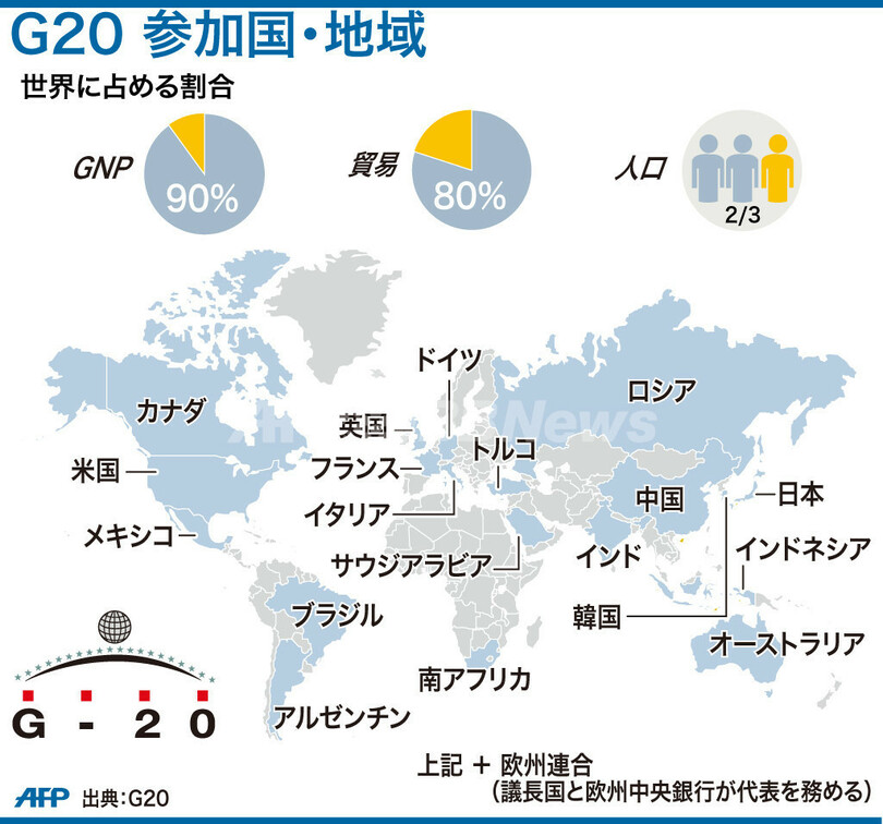 ニュース 政治・経済 図解 【図解】G20の参加国・地域 2011年10月4日 8:42 発信地:米国 [ 北米 米国 ] このニュースをシェア (c)AFP 【10月4日 AFP】図は、主要20か国・地域(G20)の参加国・地域について示したもの。(c)AFP<ニュース解説画像一覧へ> 政治・経済 一覧へ> メディア・報道関係・法人の方向け 写真・動画 購入のお問合せ>