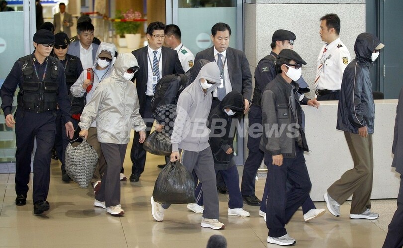 テレビでは、ソウル(Seoul)西部の仁川国際空港(Incheon International Airport)に到着し、武装警官に付き添われ、ジャケットや帽子、サングラス、マスクで顔を隠した9人の姿が放映された。