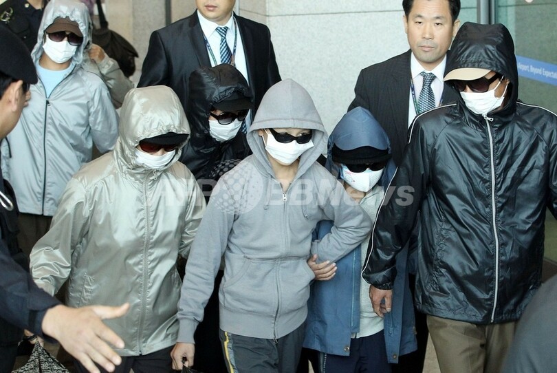 テレビでは、ソウル(Seoul)西部の仁川国際空港(Incheon International Airport)に到着し、武装警官に付き添われ、ジャケットや帽子、サングラス、マスクで顔を隠した9人の姿が放映された。