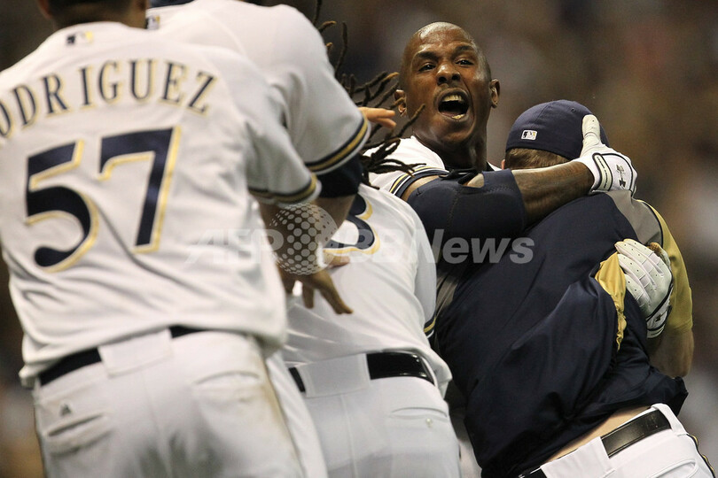 勝利を喜ぶ、ミルウォーキー・ブルワーズの選手(2011年10月7日撮影)。(c)AFP/Getty Images/Getty Images/Jonathan Daniel