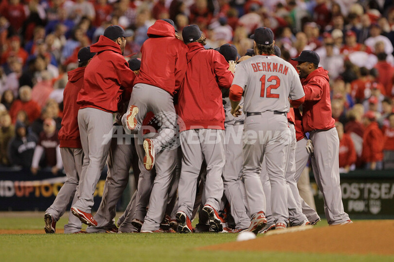 勝利に歓喜するセントルイス・カージナルスの選手(2011年10月7日撮影)。(c)AFP/Getty Images/Rob Carr