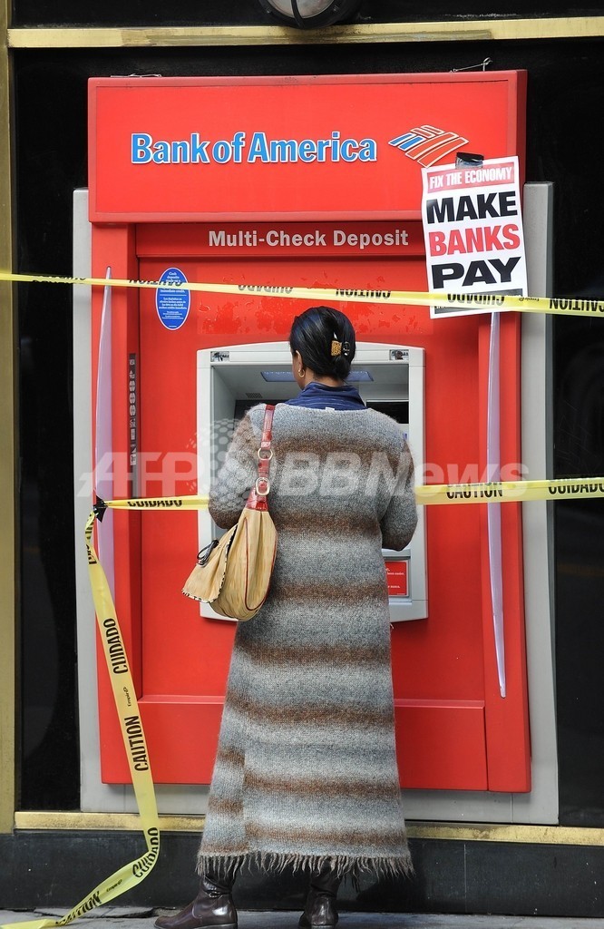 写真は、ロサンゼルス中心部で、デモ隊に立ち入り禁止を示す黄色いテープを張られたバンク・オブ・アメリカのATMを使う人(2011年10月6日撮影)。(c)AFP/ROBYN BECK