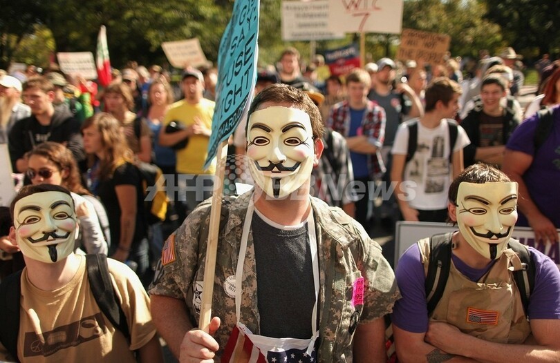 写真は、ワシントンD.C.の商工会議所前でマスクをして抗議行動をする退役軍人ら(2011年10月6日撮影)。(c)AFP/Getty Images/Chip Somodevilla