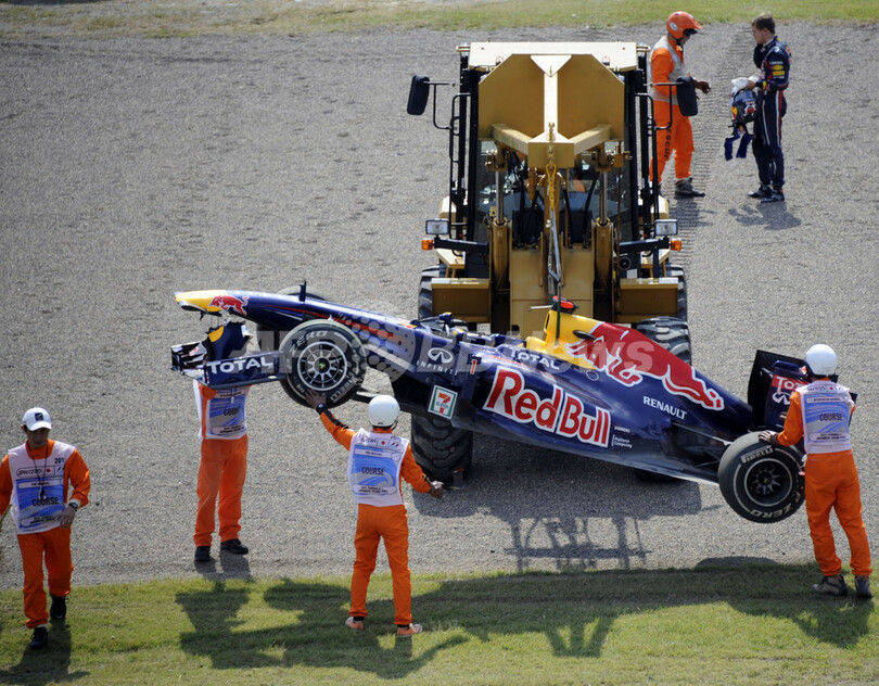 フリー走行1回目でクラッシュ後、撤去されるレッドブル(Red Bull)のセバスチャン・ベッテル(Sebastian Vettel)のマシン(2011年10月7日撮影)。(c)AFP/TOSHIFUMI KITAMURA