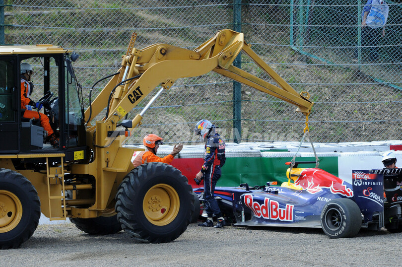 フリー走行1回目でクラッシュ後、撤去されるレッドブル(Red Bull)のセバスチャン・ベッテル(Sebastian Vettel)のマシン(2011年10月7日撮影)。(c)AFP/TOSHIFUMI KITAMURA