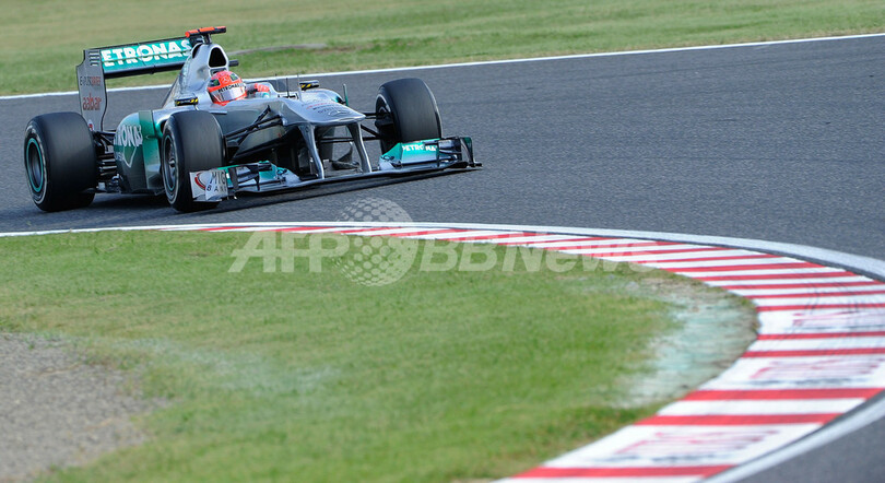 フリー走行2回目で6番手となるベストラップ1分32秒710を記録したメルセデスGP(Mercedes GP)のミハエル・シューマッハ(Michael Schumacher、2011年10月7日撮影)。(c)AFP/Toru YAMANAKA