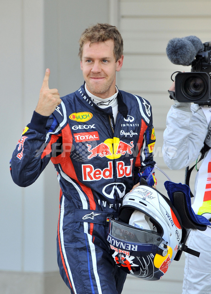 予選終了後に笑顔を見せるレッドブルのセバスチャン・ベッテル(2011年10月8日撮影)。(c)AFP/JUNG YEON-JE