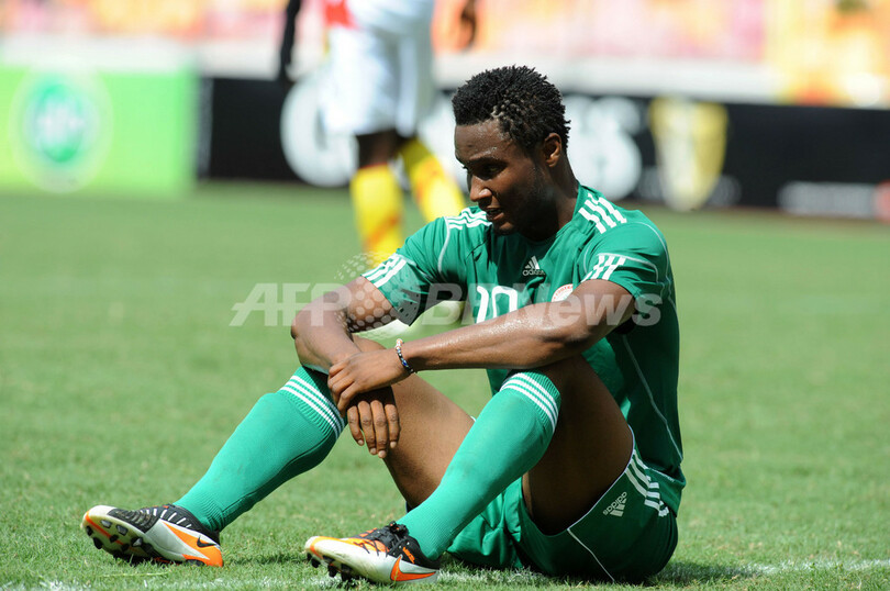 試合後、本大会の出場権を逃し、ピッチに座り込むナイジェリアのジョン・オビ・ミケル(John Obi Mikel、2011年10月9日撮影)。(c)AFP/PIUS UTOMI EKPEI