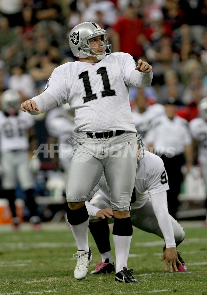 50ヤードのフィールドゴールを決めるオークランド・レイダースのKセバスチャン・ジャニコフスキー(Sebastian Janikowski、2011年10月9日撮影)。(c)AFP/Getty Images/Thomas B. Shea