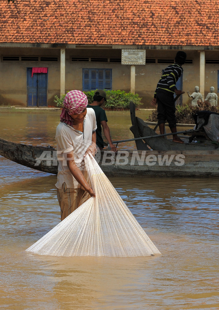 東南アジア一帯を襲った記録的な洪水で、カンボジアなどアジアの穀倉地帯で深刻な被害が出ており、食料価格の高騰や、被災地域でも貧困層に属する農業従事者らへの影響が懸念されている。写真は、首都プノンペン(Phnom Penh)東方60キロのプレイベン(Prey Veng)県で、冠水した学校の校舎前で漁をする男性(2011年10月6日撮影)。(c)AFP/TANG CHHIN SOTHY