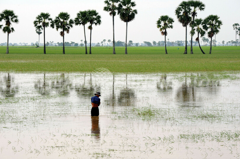 東南アジア一帯を襲った記録的な洪水で、カンボジアなどアジアの穀倉地帯で深刻な被害が出ており、食料価格の高騰や、被災地域でも貧困層に属する農業従事者らへの影響が懸念されている。写真は、首都プノンペン(Phnom Penh)東方60キロのプレイベン(Prey Veng)県で、冠水した畑を歩く男性(2011年10月6日撮影)。(c)AFP/TANG CHHIN SOTHY